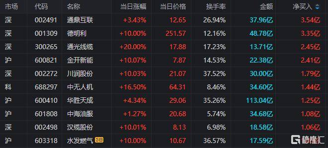 在龙虎榜中,涉及深股通专用席位(wei)的个股有(you)11只(zhi),通鼎互联的深股通专用席位(wei)净买入额最大,净买入2.97亿元。