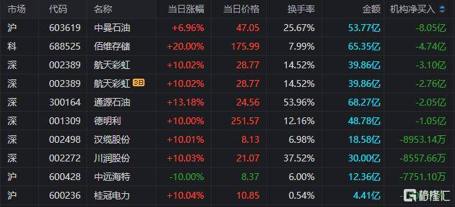 龙虎榜中涉及机构专用席位(wei)的个股中,当日净卖(mai)出额前三为(wei)中曼石油、佰维(wei)存储、航天彩虹,分别为(wei)8.05亿元、4.74亿元、3.10亿元。