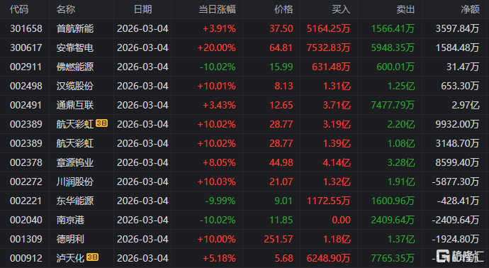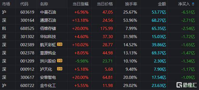 龙虎榜单日净卖(mai)出额前三为(wei)中曼石油、通源石油、佰维(wei)存储,分别为(wei)6.51亿元、2.71亿元、2.54亿元。