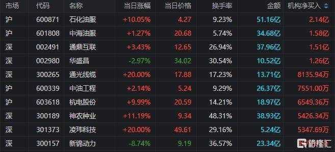 龙虎榜中涉及机构专用席位(wei)的个股中,当日净买入额前三为(wei)石化(hua)油服、中海油服、通鼎互联,分别为(wei)2.14亿元、1.58亿元、1.51亿元。