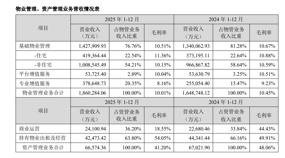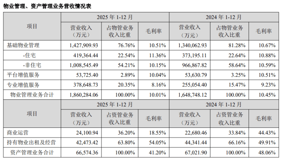 更(geng)深层次的挑战则来自于其业(ye)务增长与毛利结构的错配(pei)。年报数据显示,物业(ye)管(guan)理业(ye)务中,增长最迅(xun)猛的专业(ye)增值服务板(ban)块收入同比增长高达48.46%,但(dan)其毛利率却是所有细分业(ye)务中最低(di)的,仅(jin)为8.16%。