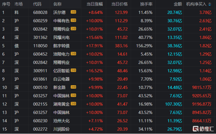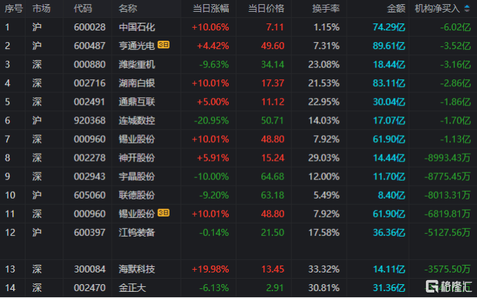 龙虎(hu)榜中触及机构公用(yong)席位(wei)的个(ge)股中,单日净卖出额前三为我国(guo)石化、潍柴(chai)重机、湖南白银,分别为6.02亿、3.16亿、2.86亿。