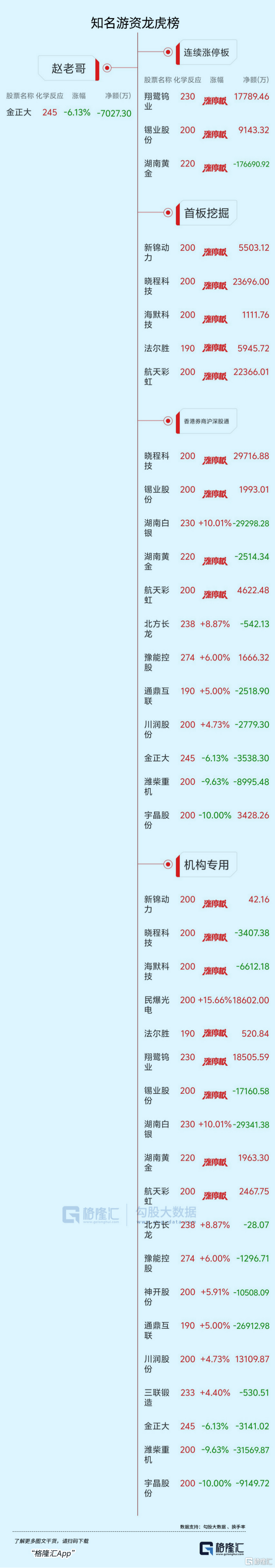 法(fa)尔胜6天5板,招商轮船7天4板,泰嘉股分6天4板,洲际油(you)气5天3板,华锡有色4天3板,长源(yuan)东谷3连板,赤天化4天2板,江顺科技3天2板,赫美团体、湖南黄金、锡业股分、翔鹭(lu)钨业、华盛昌、新金路、我国(guo)天楹(ying)、亚盛团体、长城科技、泰晶科技、利通(tong)电子、中有数色、和顺石油(you)、水发(fa)燃气、我国(guo)瑞(rui)林、涪陵(ling)电力、烽火(huo)通(tong)信2连板。