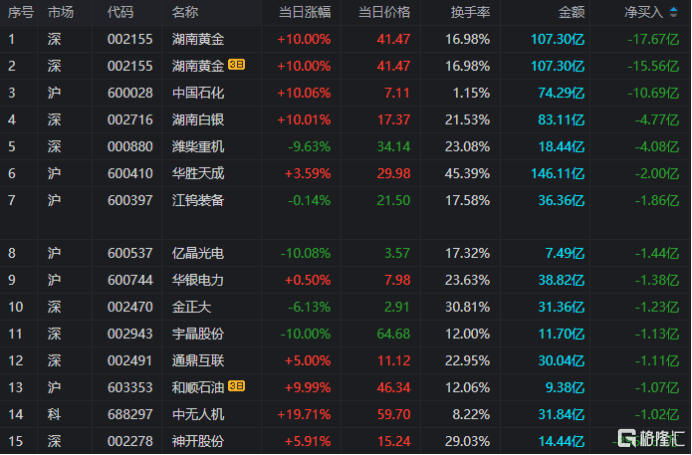 龙虎(hu)榜单日净卖出额前三为湖南黄金、我国(guo)石化、湖南白银,分别为17.67亿、10.69亿、4.77亿。
