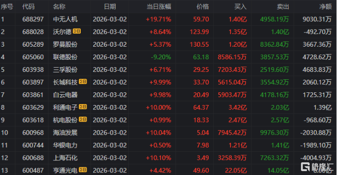 在(zai)龙虎(hu)榜中,触及沪股通(tong)公用(yong)席位(wei)的个(ge)股有12只,中无人(ren)机的净买入额最(zui)大,9030.31万元。