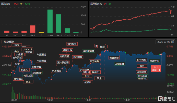 3月(yue)2日,A股三大指(zhi)数涨跌不(bu)一,停止收盘,沪指(zhi)涨0.47%报4182点,深证成(cheng)指(zhi)跌0.2%,创(chuang)业板指(zhi)跌0.49%。