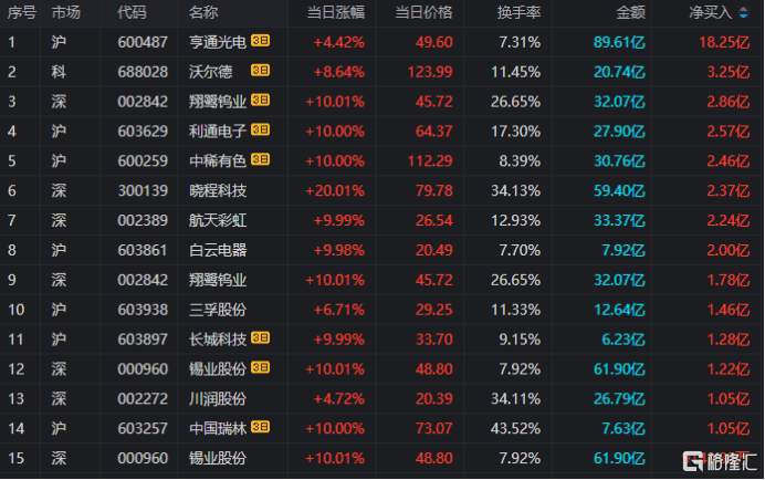龙虎(hu)榜单日净买入额前三为晓程科技、航天彩虹、白云电器,分别为2.37亿、2.24亿、2亿。