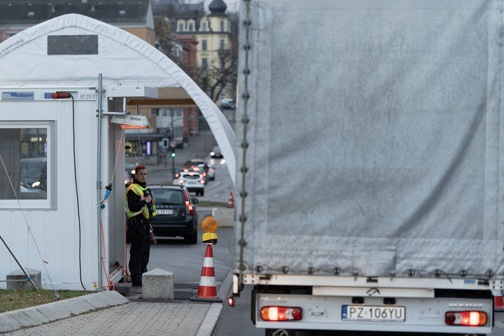 目前,德波两国相(xiang)互收紧边境管控,在口岸对往来人员实施身份证件抽查。在高峰时段(duan),桥面上常常排起长队。