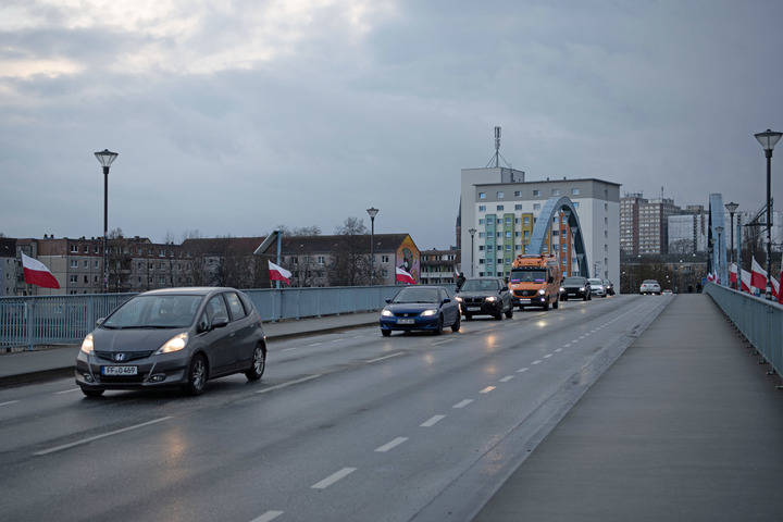 3月16日(ri),车(che)辆(liang)通过德国和波兰(lan)边境的(de)奥德河界桥从德国奥德河畔法兰(lan)克福驶向波兰(lan)斯(si)武比采。 新华社记者 张(zhang)豪夫 摄